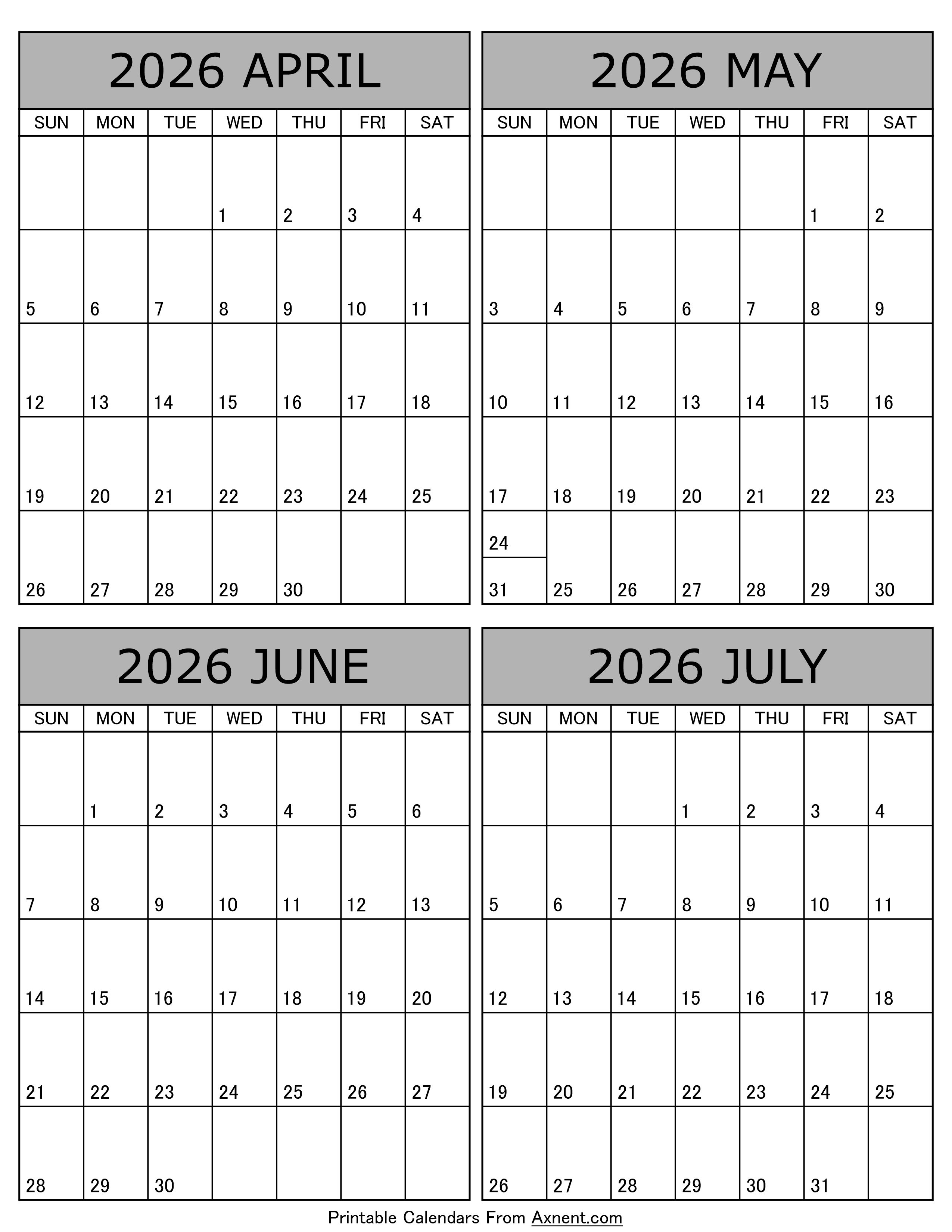 April May June July 2026 Calendar