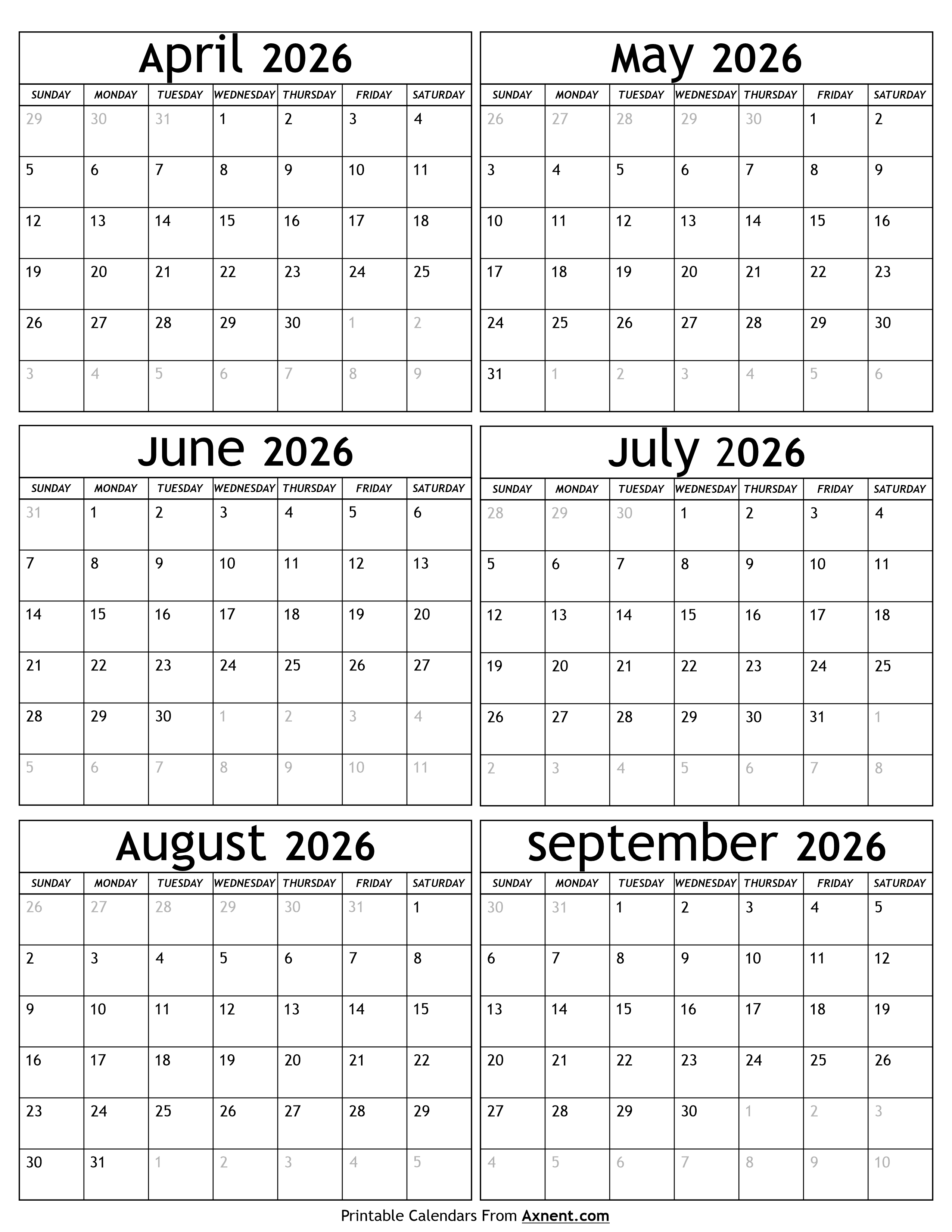 April to September 2026 Calendar