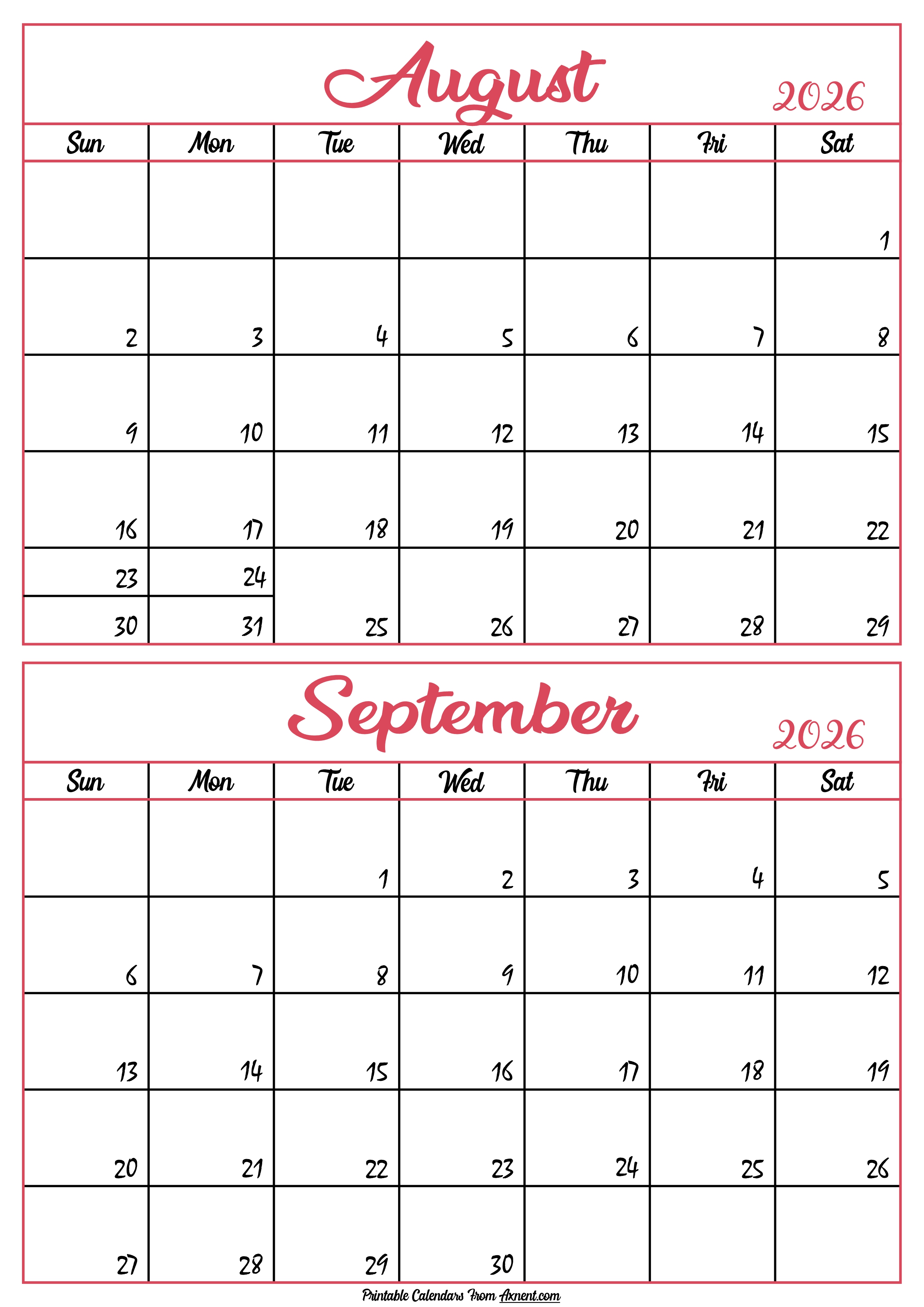 Calendar 2026 August September