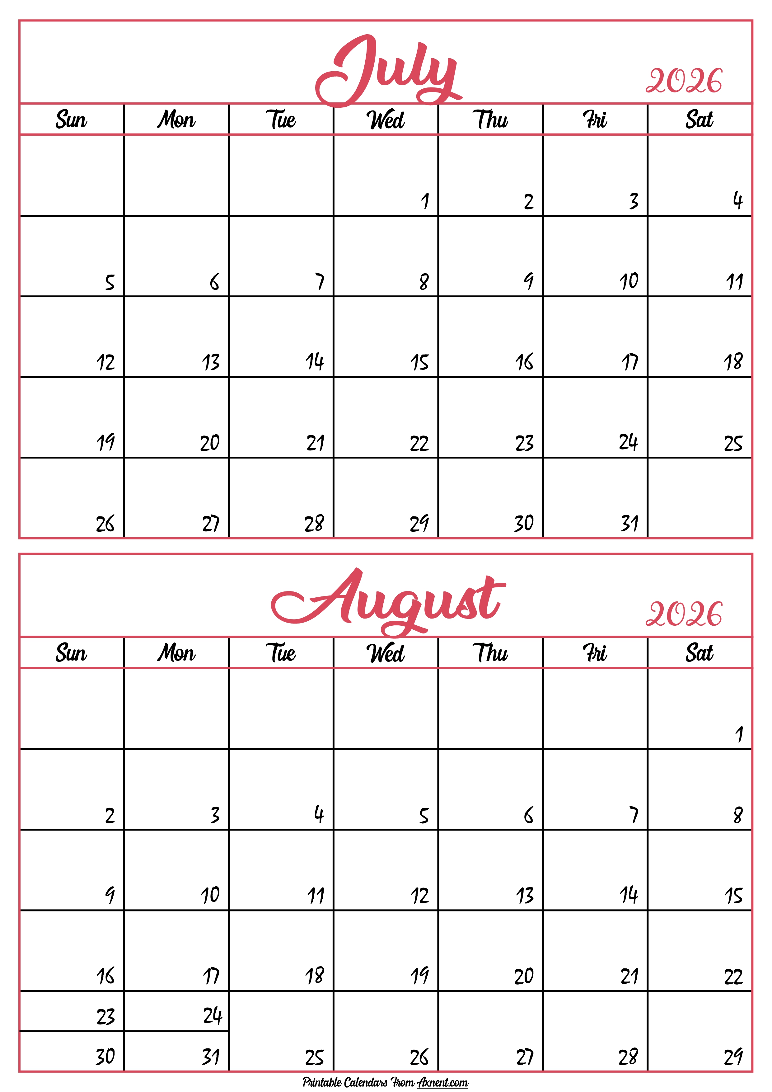 Calendar 2026 July August