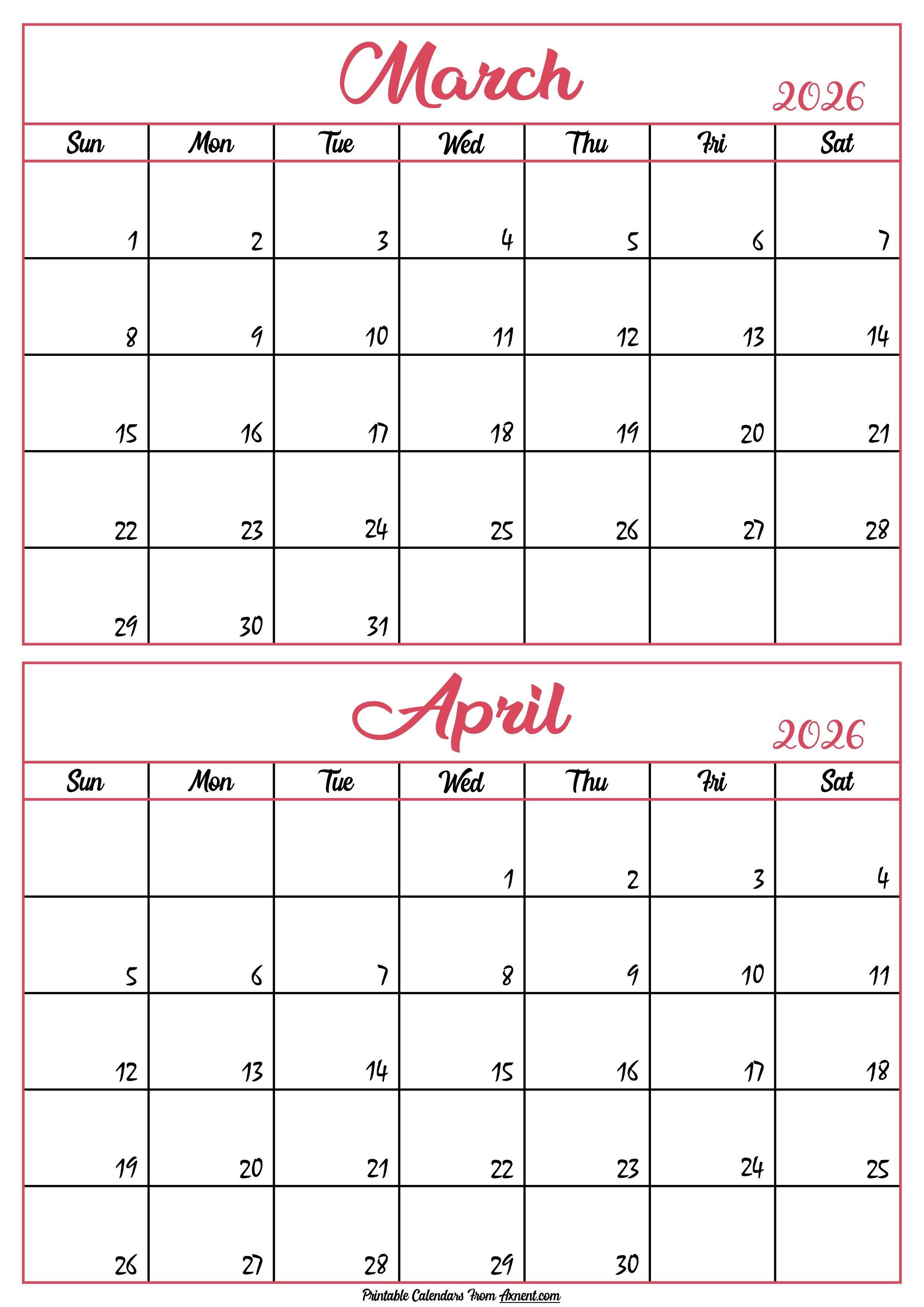 Calendar 2026 March April