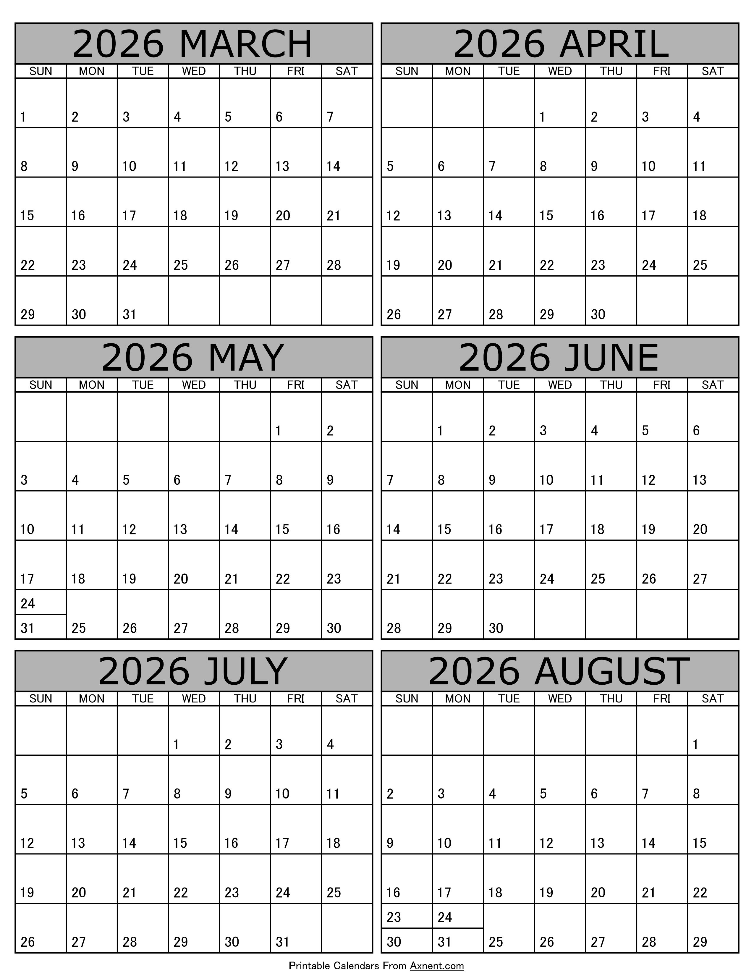 Calendar 2026 March to August