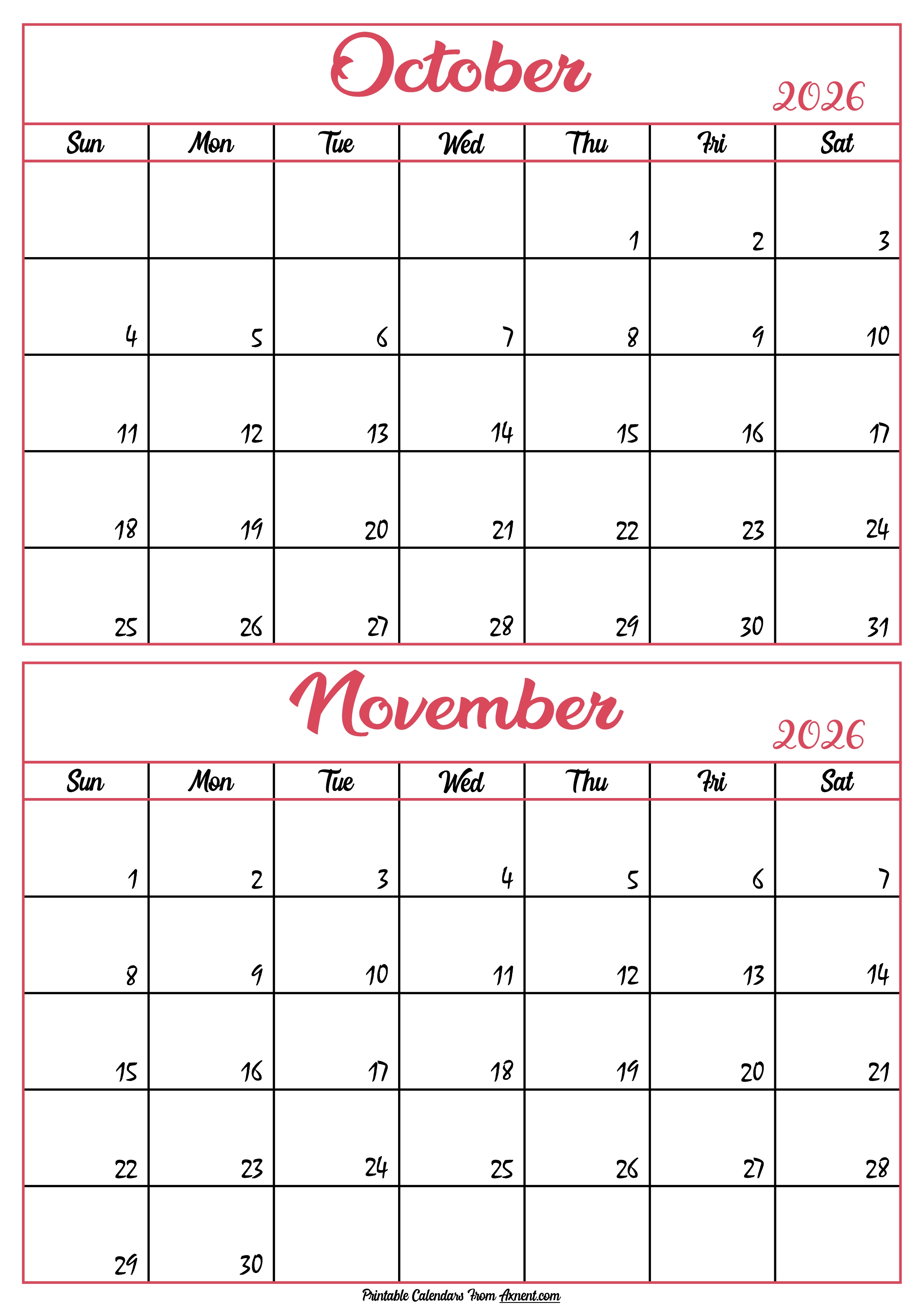 Calendar 2026 October November