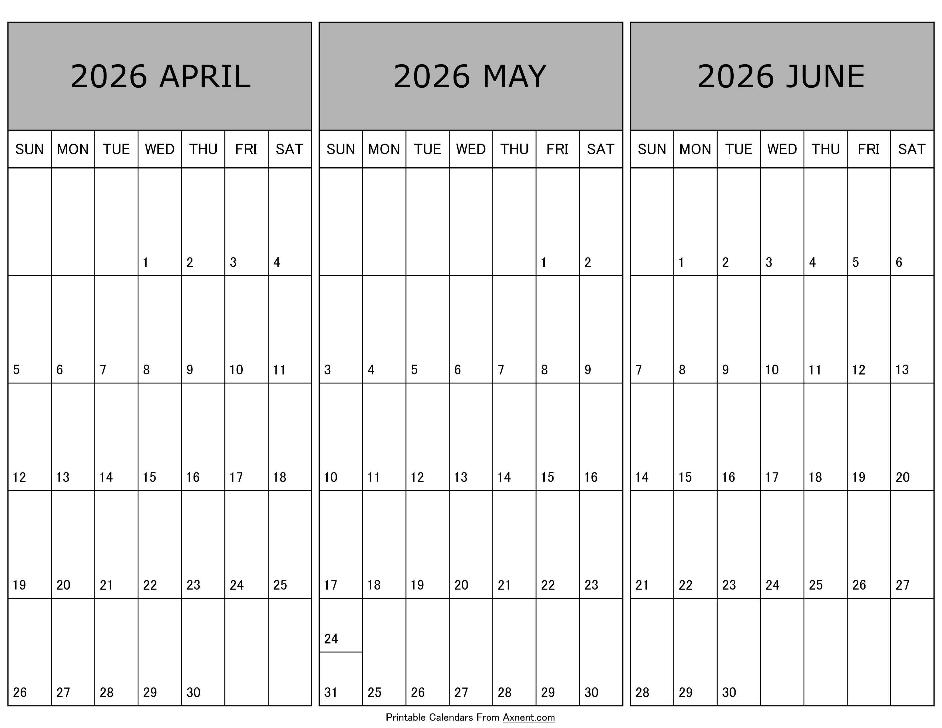 Calendar April May June 2026