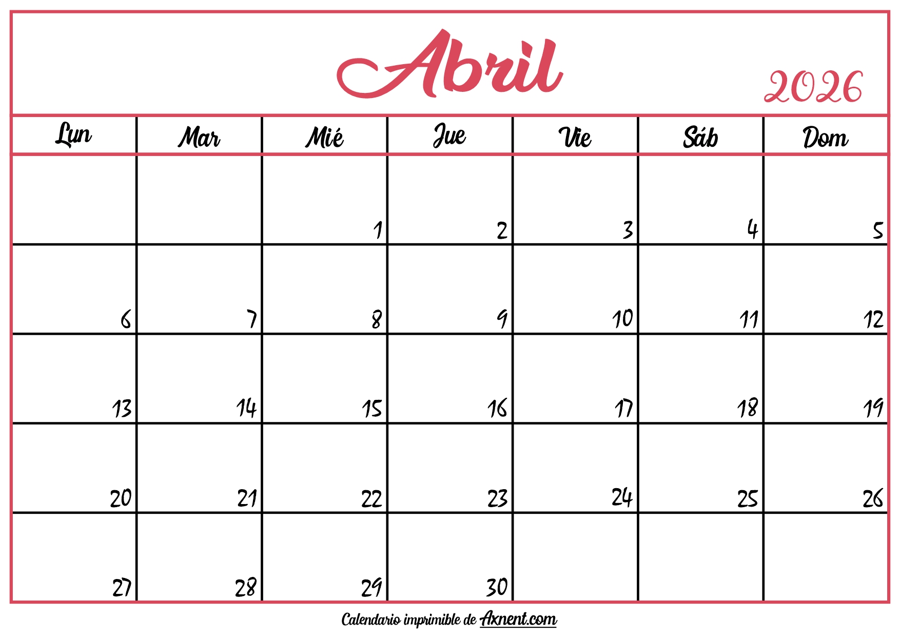 Calendario En Blanco Abril 2026