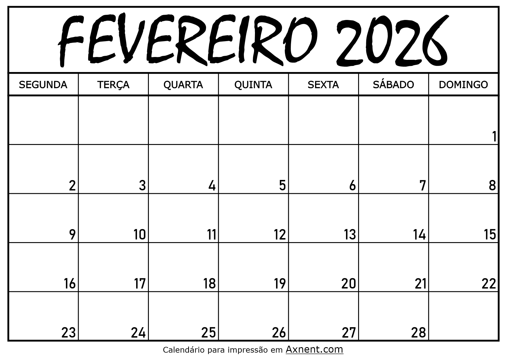 Calendário Mensal Fevereiro 2026