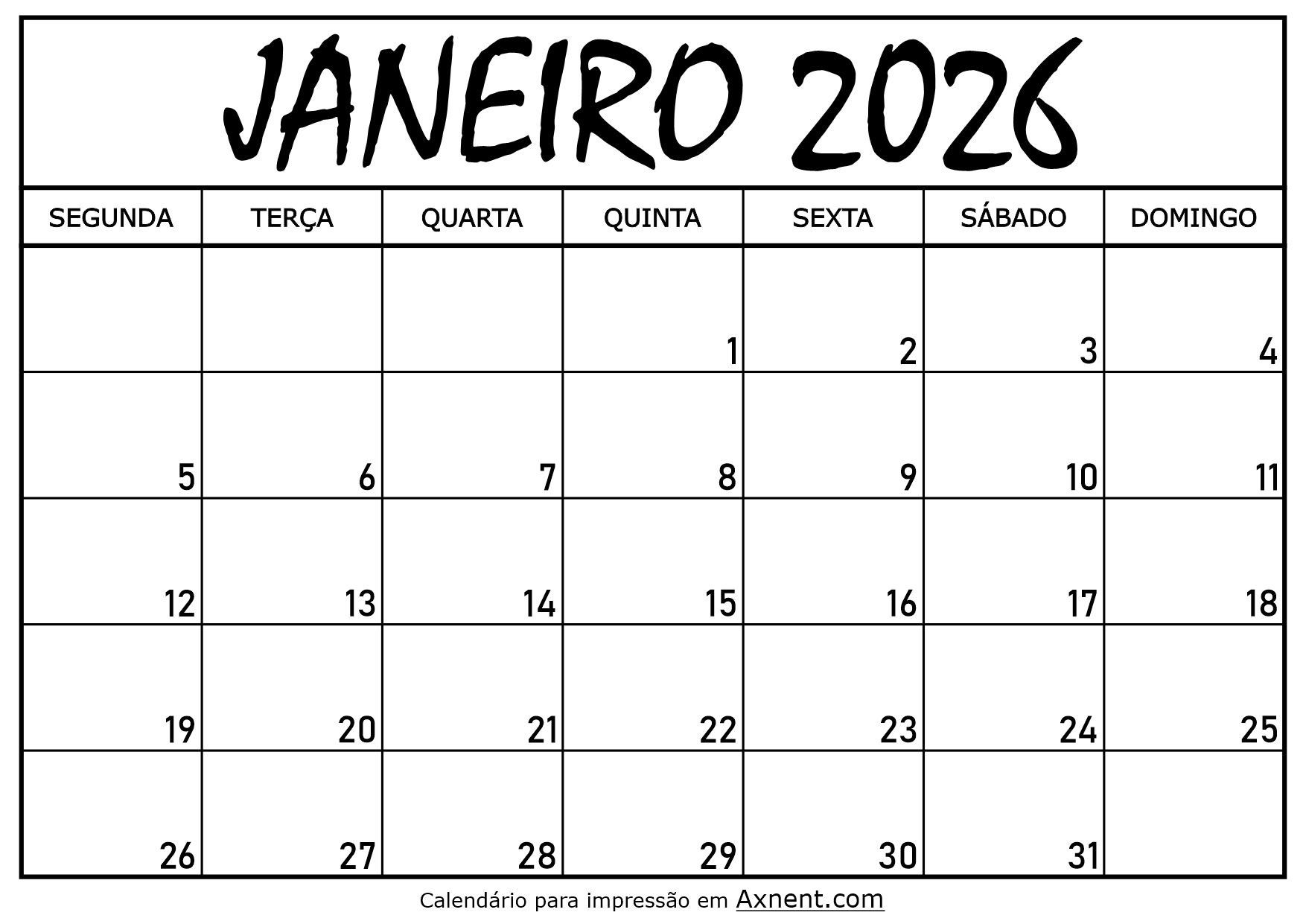 Calendário Mensal Janeiro 2026