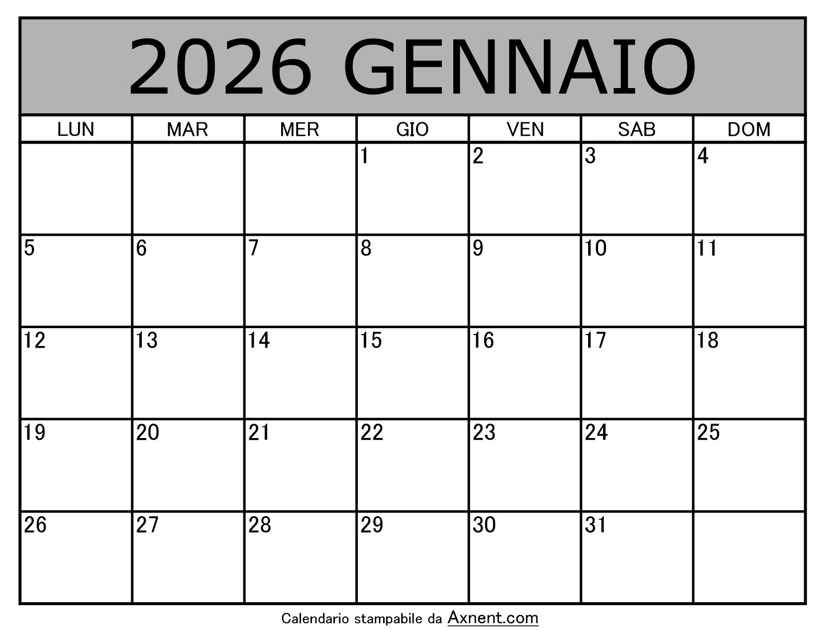 Calendario Mensile di Gennaio 2026