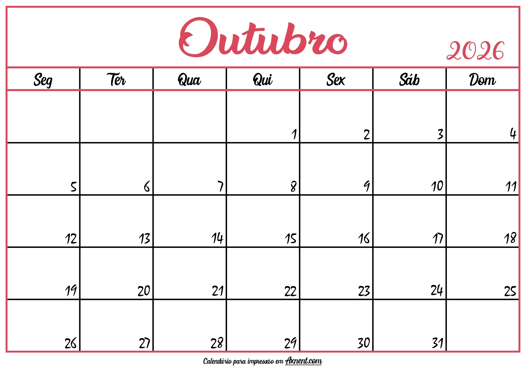 Calendário Outubro 2026