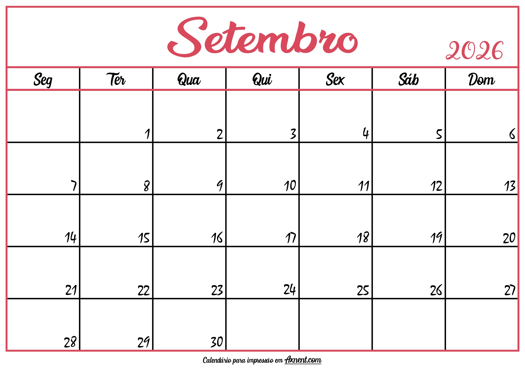 Calendário Setembro 2026