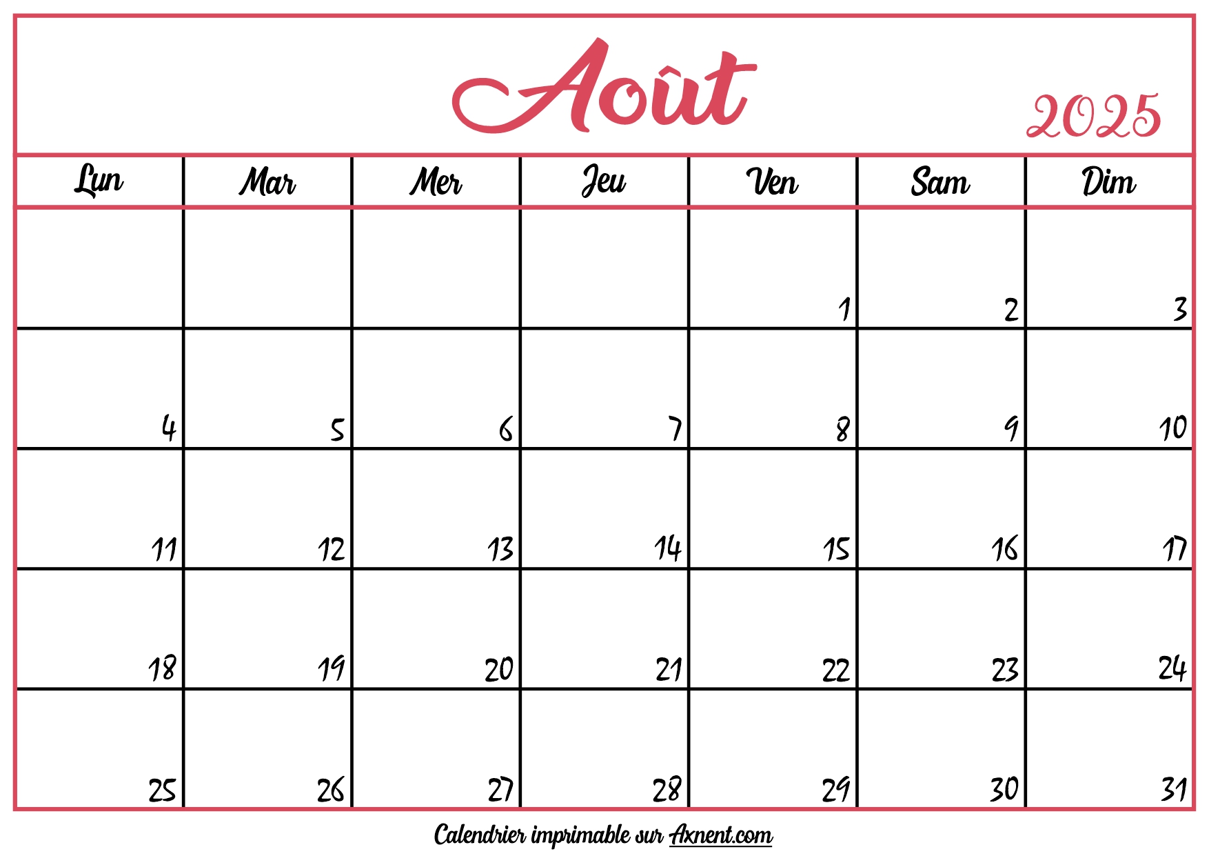 Calendrier Vierge Août 2025