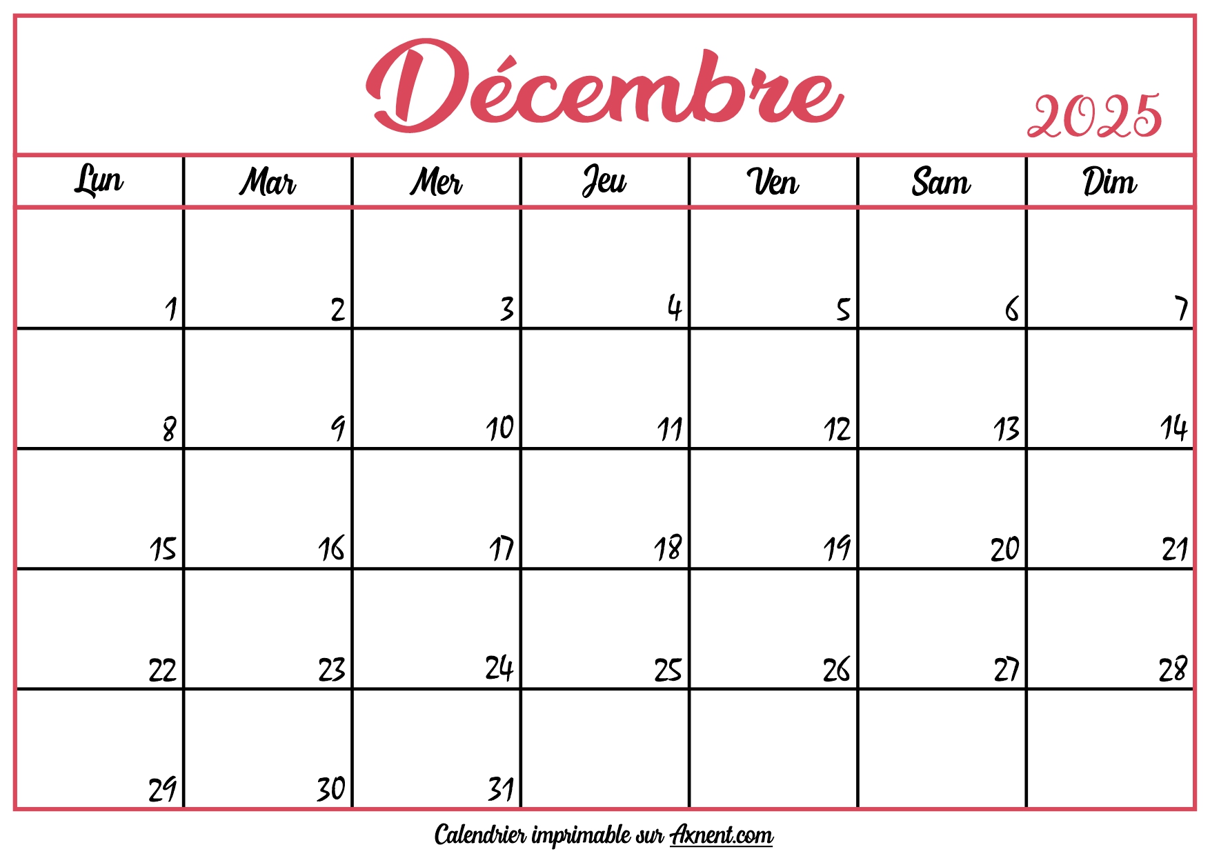 Calendrier Vierge Décembre 2025
