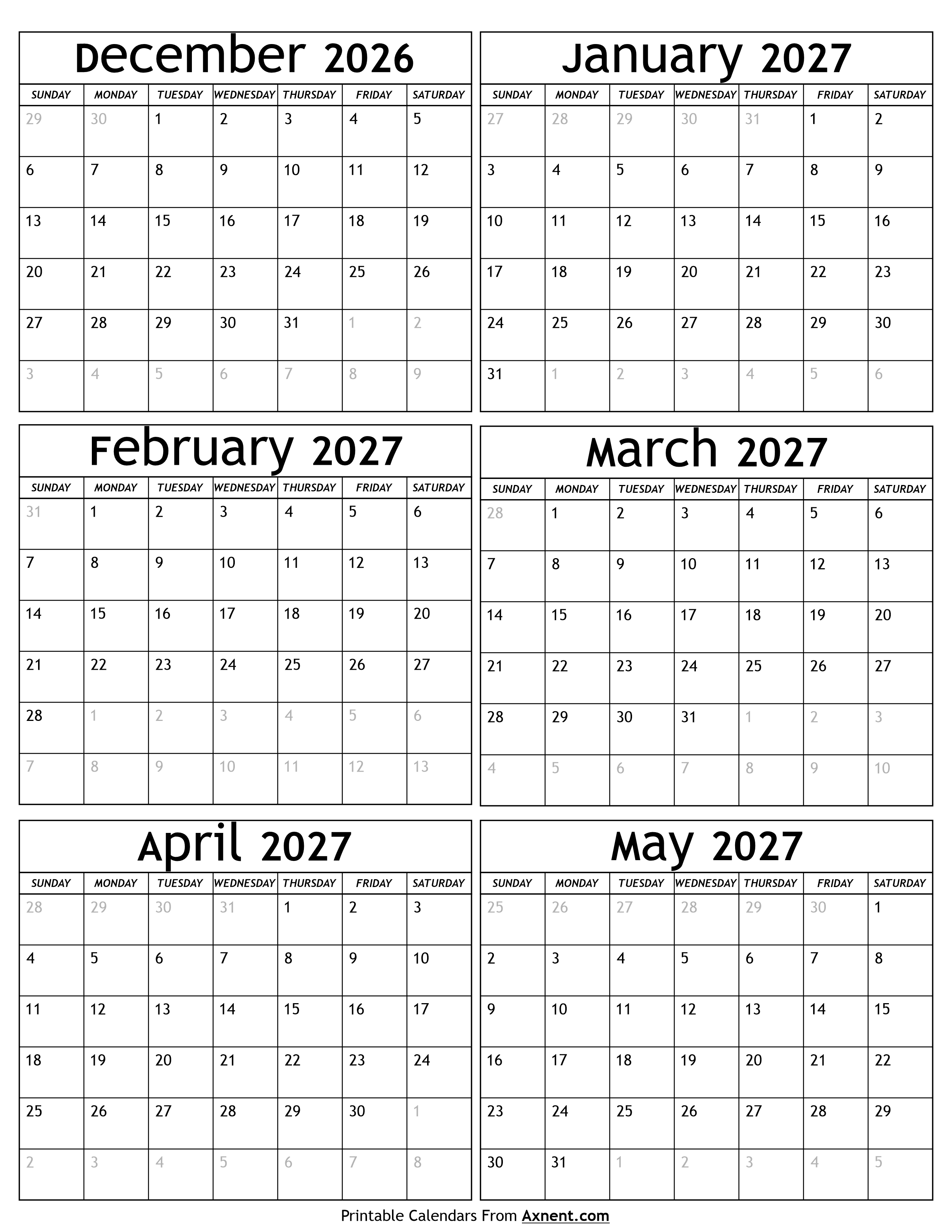 December 2026 to May 2027 Calendar