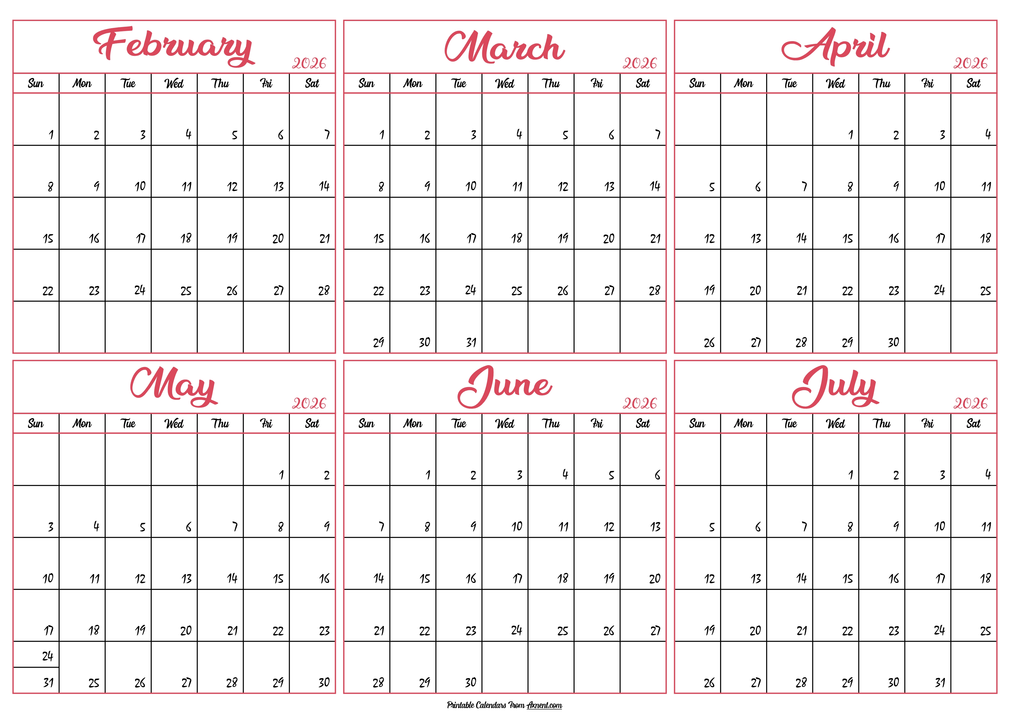 February to July Calendar 2026