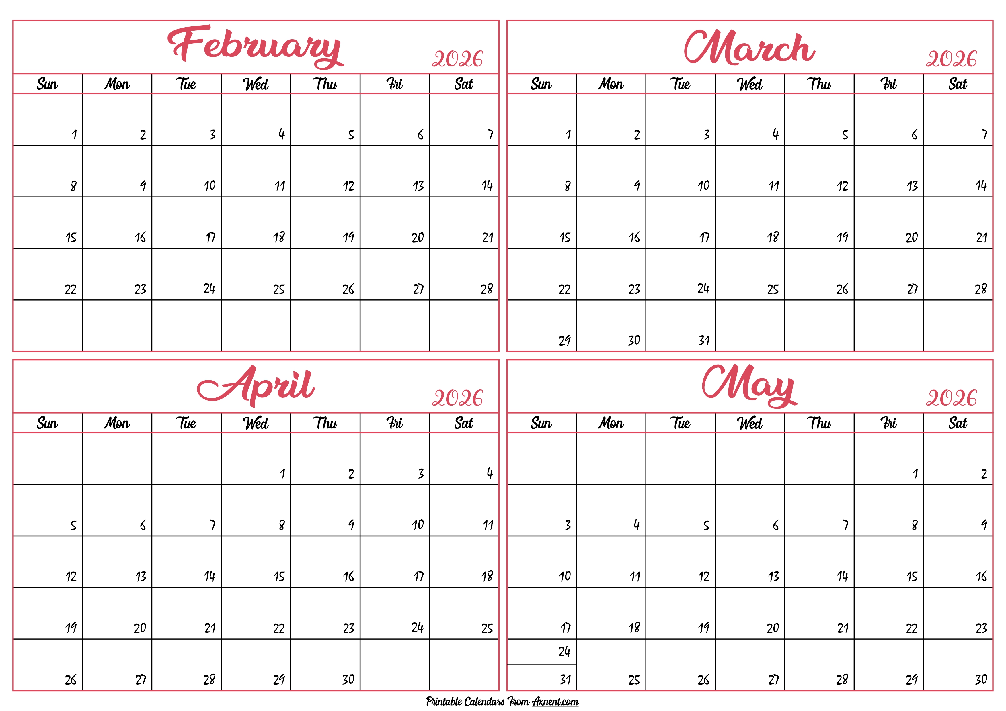 February to May Calendar 2026