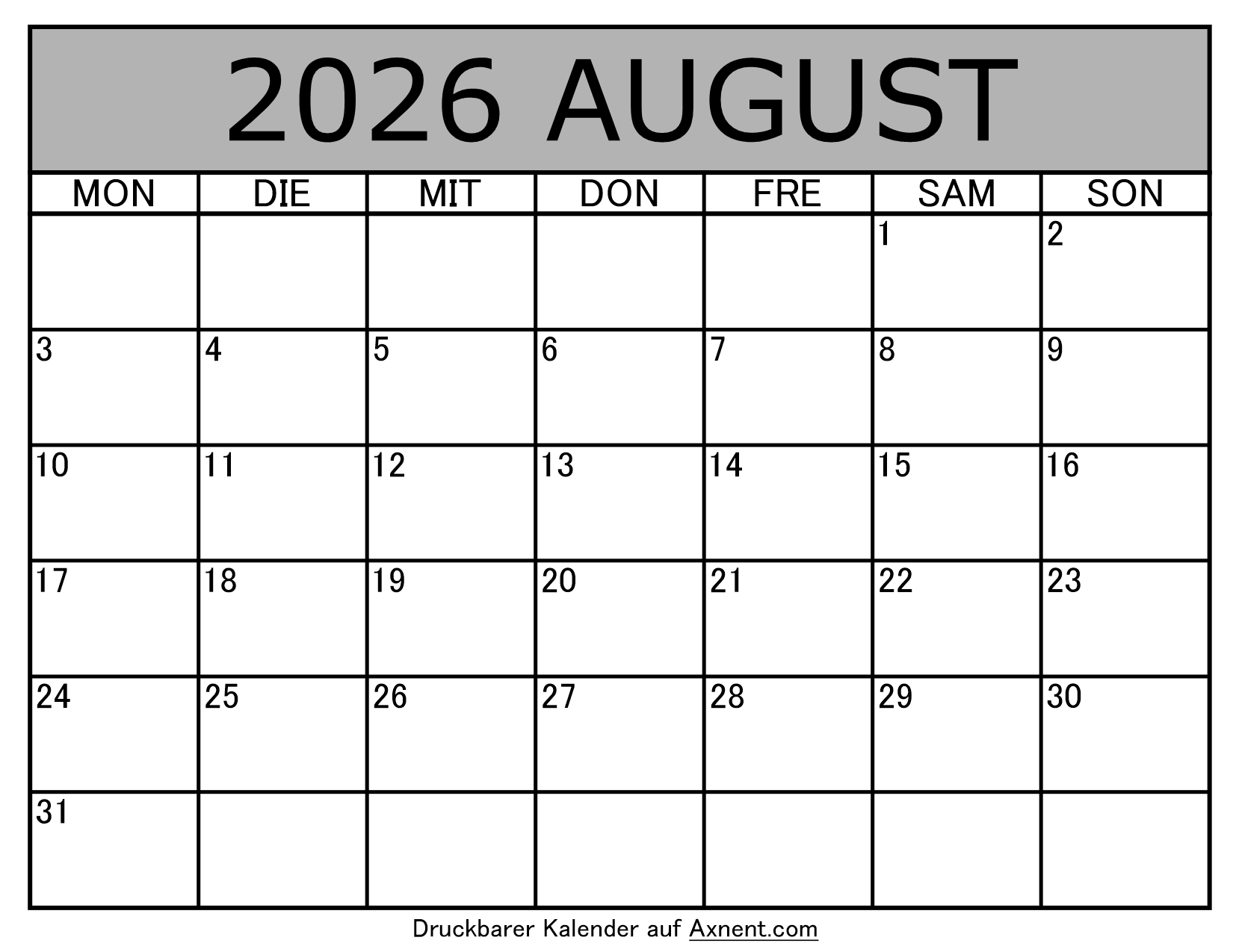 January 15, 2026 Kalender August 2026 zum Ausdrucken Posted by Admin Kalender August 2026 zum Ausdrucken