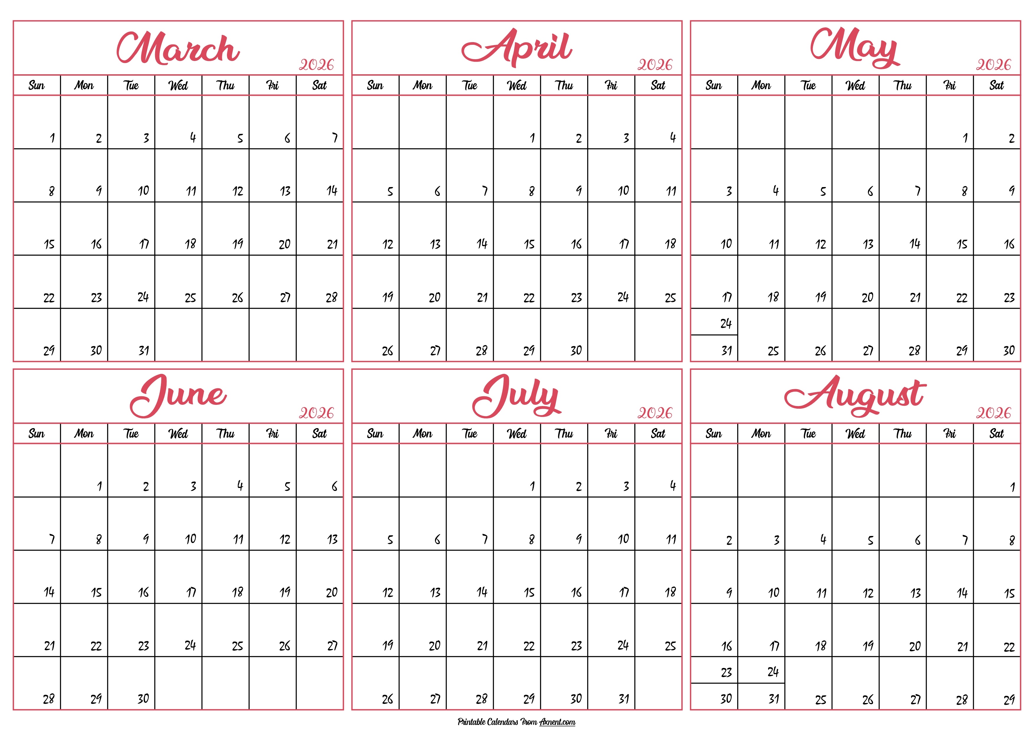 March to August Calendar 2026
