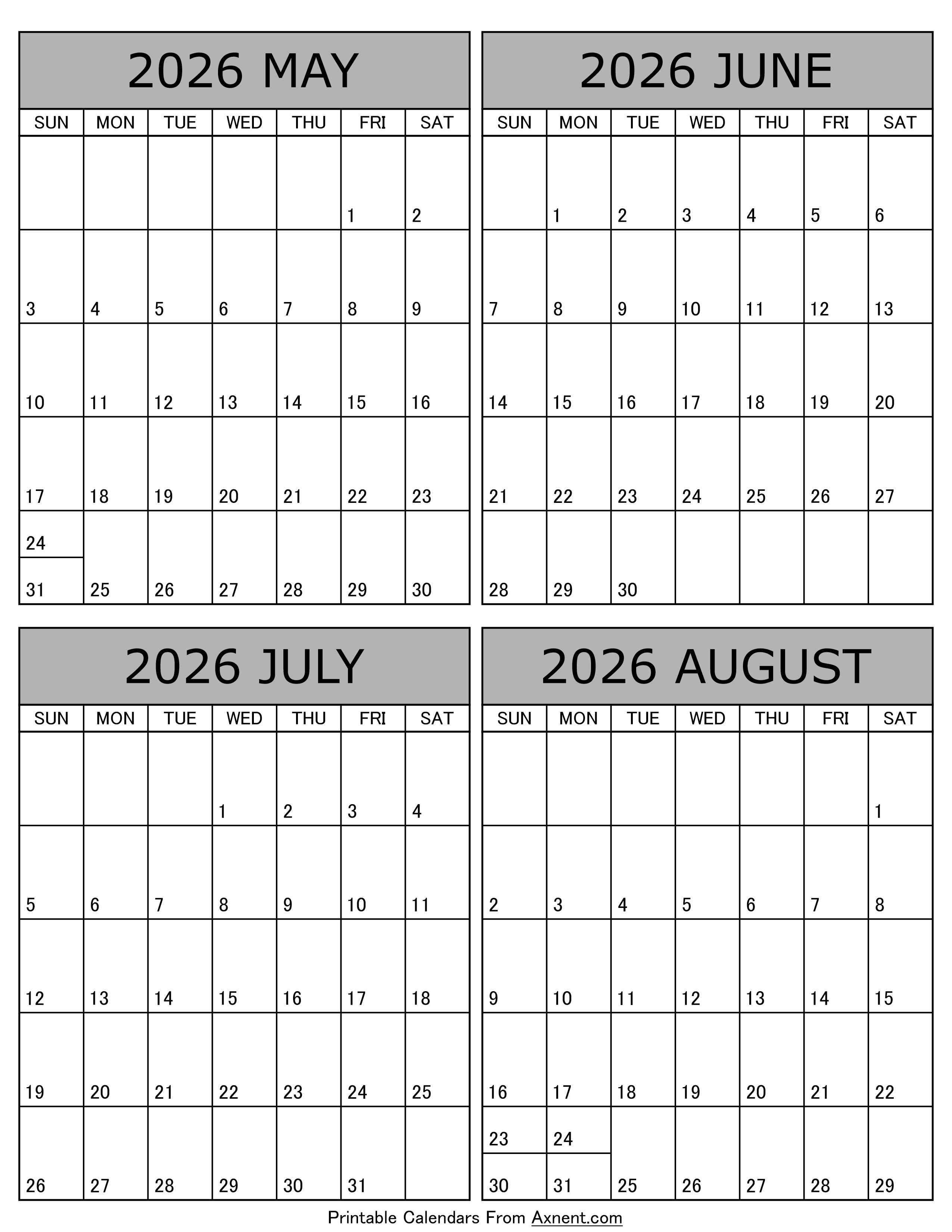 September 25, 2025 May June July August 2026 Calendar Posted by Admin May June July August 2026 Calendar