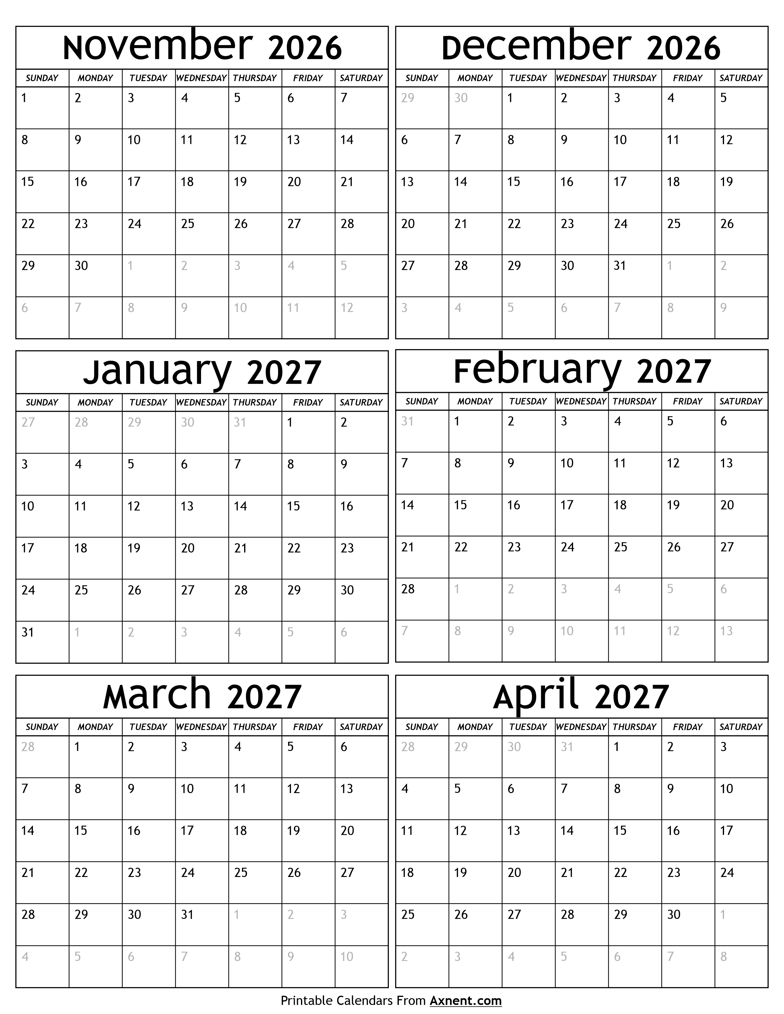 February 28, 2026 November 2026 to April 2027 Calendar Posted by Admin November 2026 to April 2027 Calendar