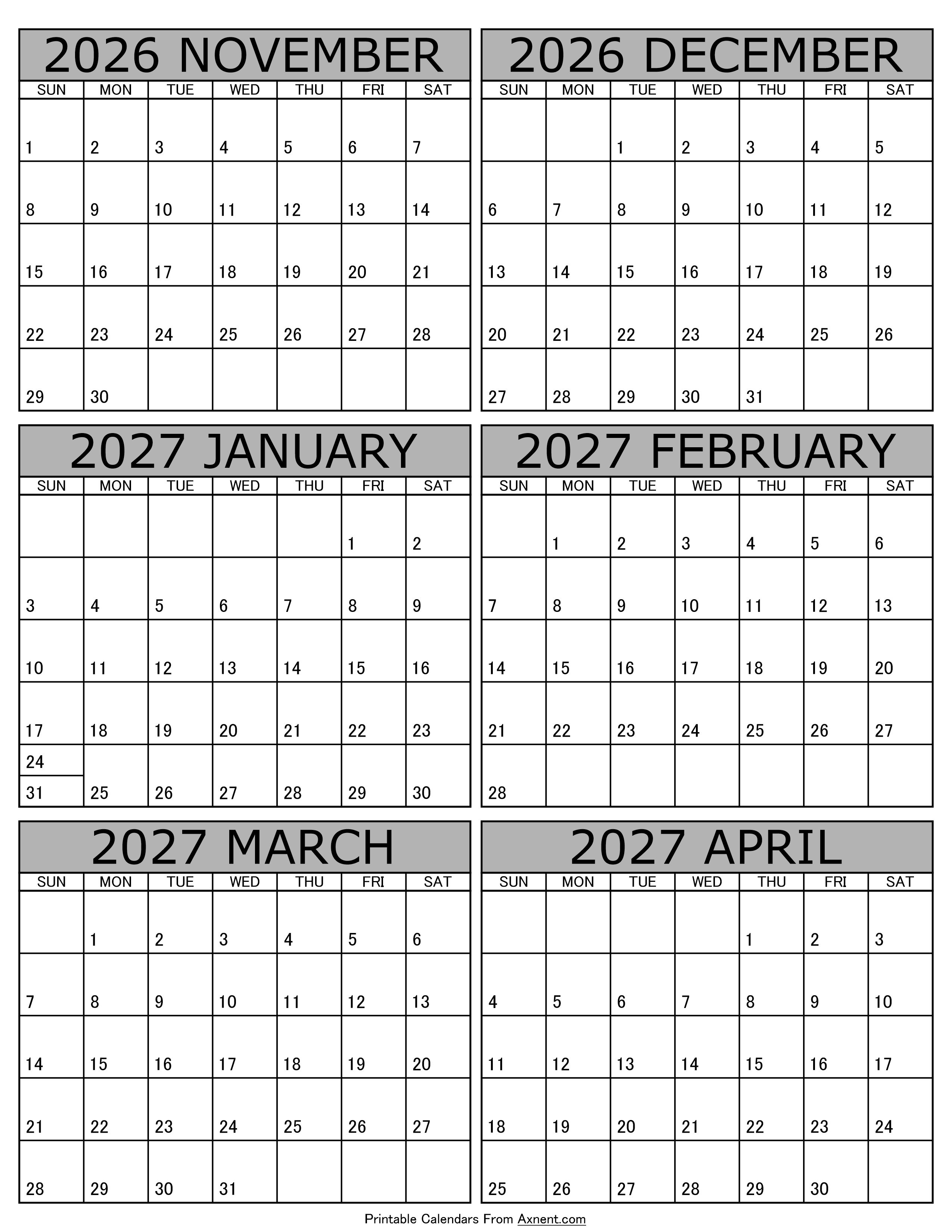 February 28, 2026 Printable November 2026 to April 2027 Calendar Posted by Admin Printable November 2026 to April 2027 Calendar