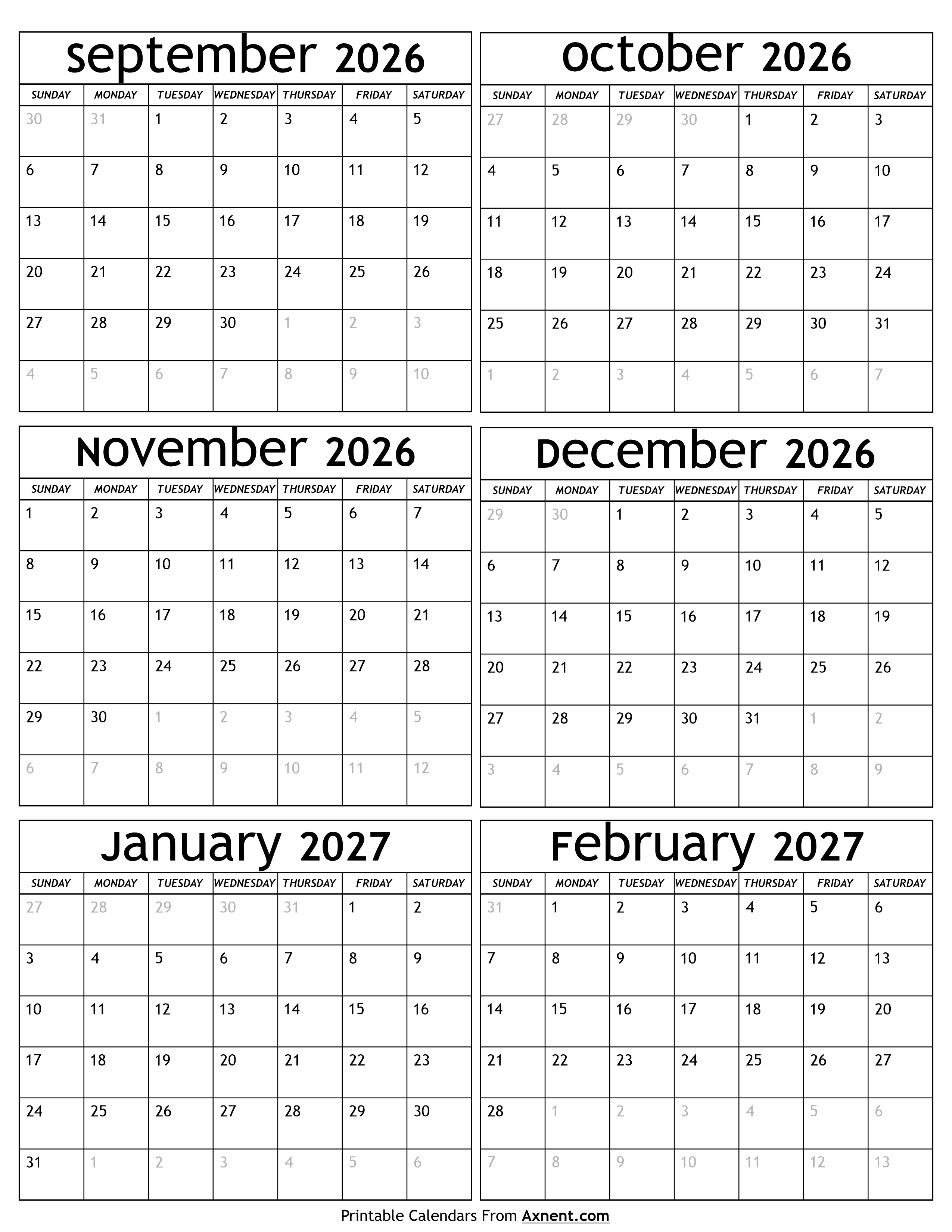 January 14, 2026 September 2026 to February 2027 Calendar Posted by Admin September 2026 to February 2027 Calendar